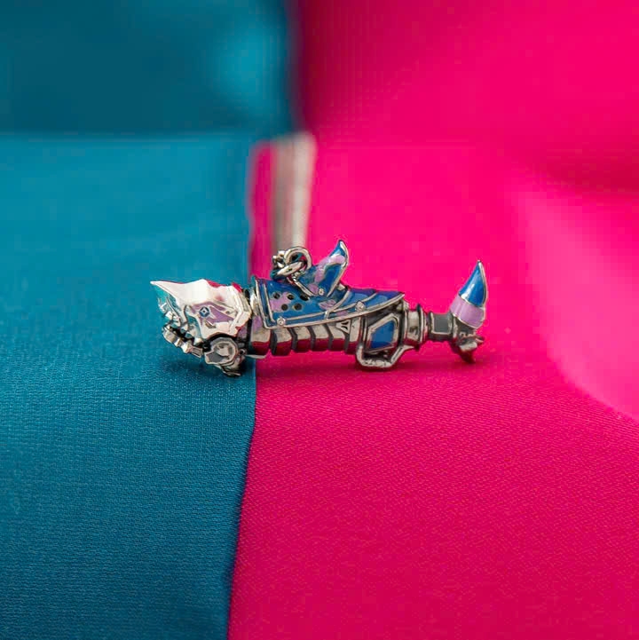 Handcrafted in durable nickel-free artisan brass and plated with striking black rhodium and silver, the Fishbones Necklace captures Jinx's engineering ingenuity and her love of mayhem. Bringing the stylized weapon to life in wearable miniature, the lower jaw of Fishbones features an articulated component that opens and closes with a charming "CHOMP". Enhanced with blue and purple enamel accents in Jinx’s signature graffiti style, the pendant hangs from an adjustable black rhodium-plated curb chain, complete with a signature tag.