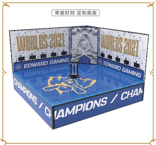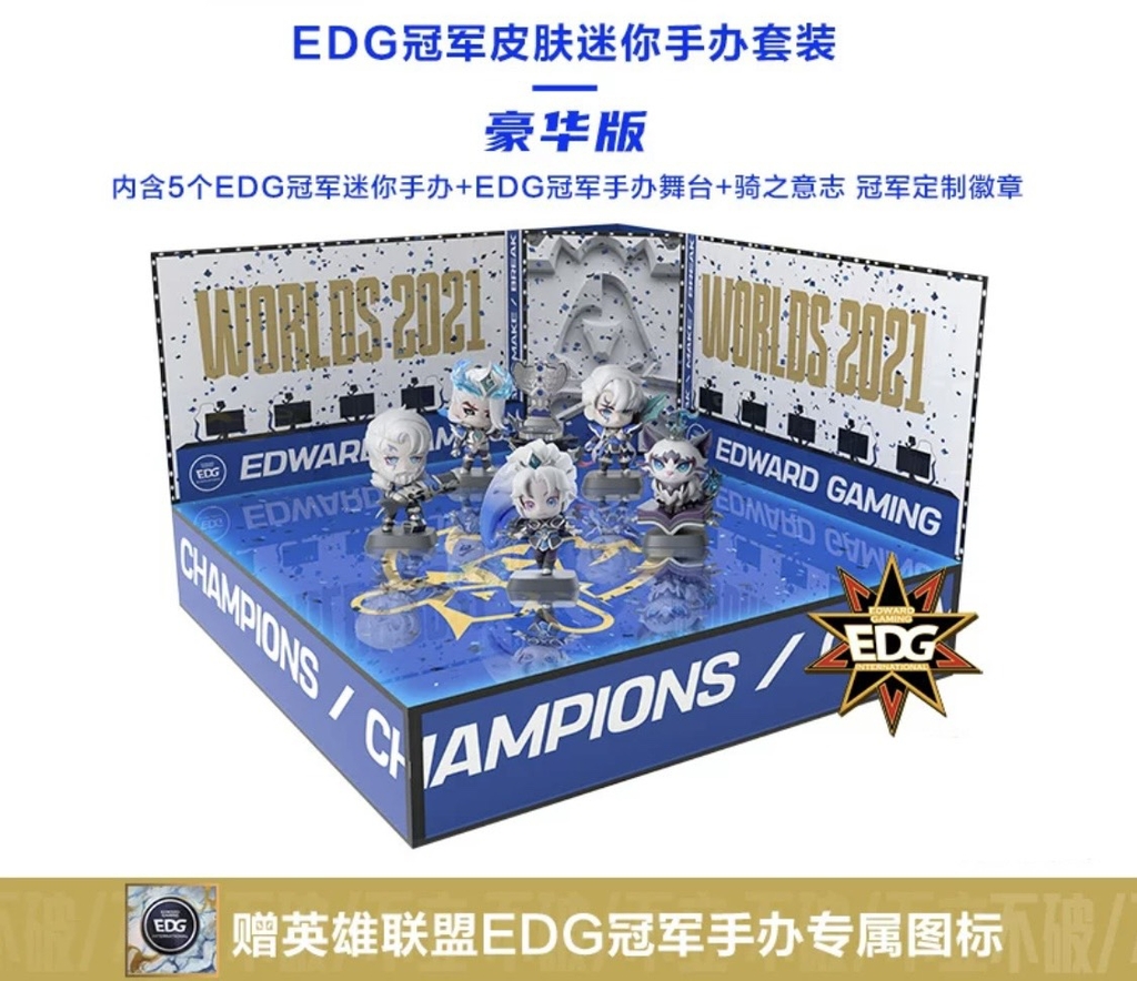 Celebrate EDward Gaming, 2021 Worlds Winner, with this collectible vinyl figure set! The set comes with Zoe, Viego, Graves, Aphelios, and Yuumi in their new EDG-themed skins, and also features signatures from Flandre, Jie Jie, Scout, Viper, and Meiko on their respective champion bases.